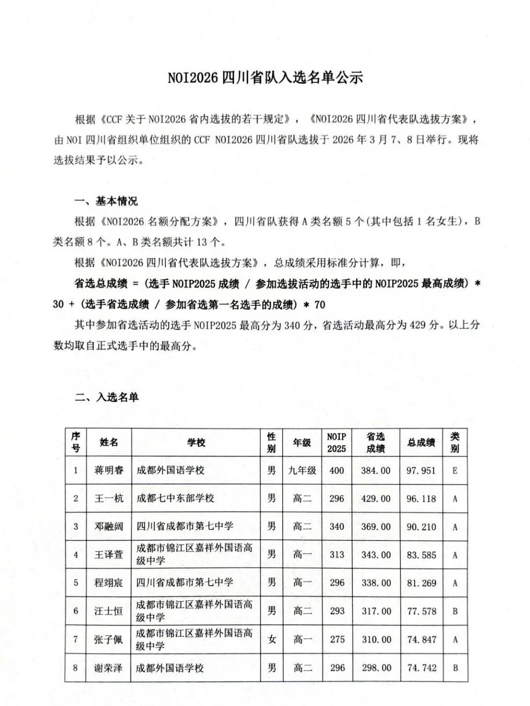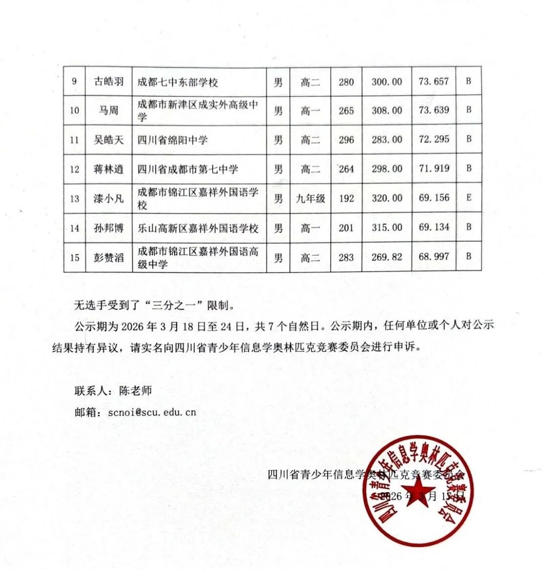 NOI2026四川省省内选拔活动结果公示